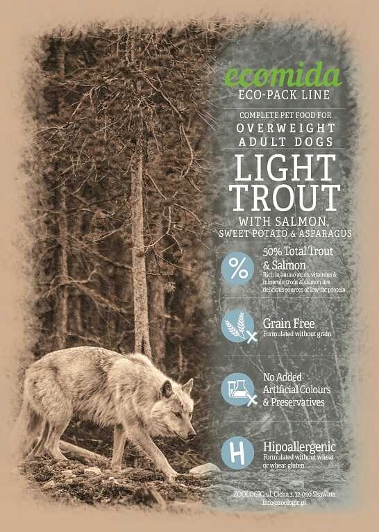 Pstrąg i łosoś 50% (w t ym świeżo przygotowany pstrąg 30%, suszony łosoś 11%, świeżo przygotowany łosoś 4%, olej z łososia 3%, bulion łososiowy 2%), bataty (24%), ziemniaki, groszek (6%), pulpa buraczana, białko grochu, siemię lniane, białko ziemniaczane, minerały, szparagi (0,3%), glukozamina (170 mg/kg), met ylosulfonylometan (170 mg/kg), siarczan chondroit yny (125 mg/ kg), fruktooligosachar ydy (FOS, 96 mg/kg), mannanooligosachar ydy (MOS, 24 mg/kg)