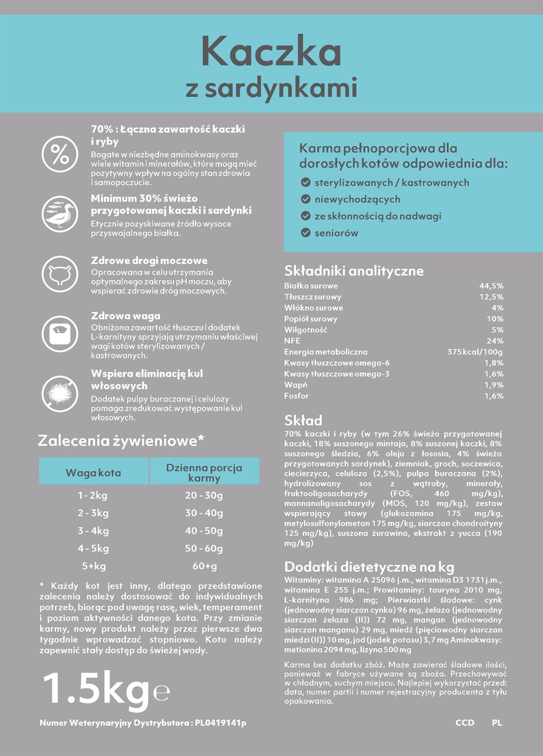 Ecomida Connoisseur Kaczka Sardynki 1,5 kg sucha karma bezzbożowa dla kotów dorosłych i seniorów