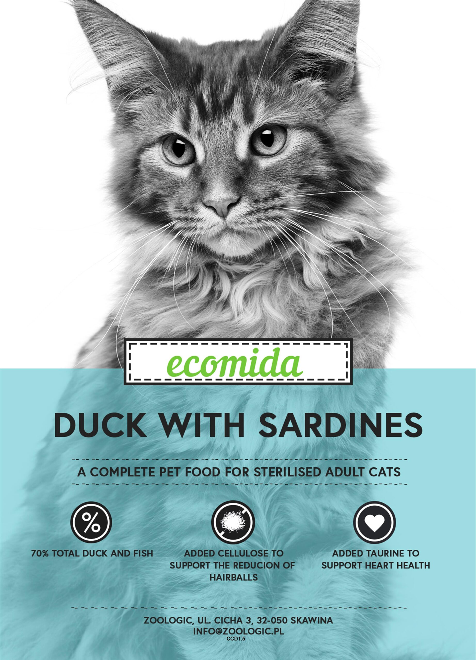 Ecomida Connoiseur to sucha karma pełnoporcjowa, która jest odpowiednia dla kotów dorosłych również sterylizowanych. Produkt bezzbożowy, z dużą zawartością świeżego mięsa kaczki oraz sardynek.