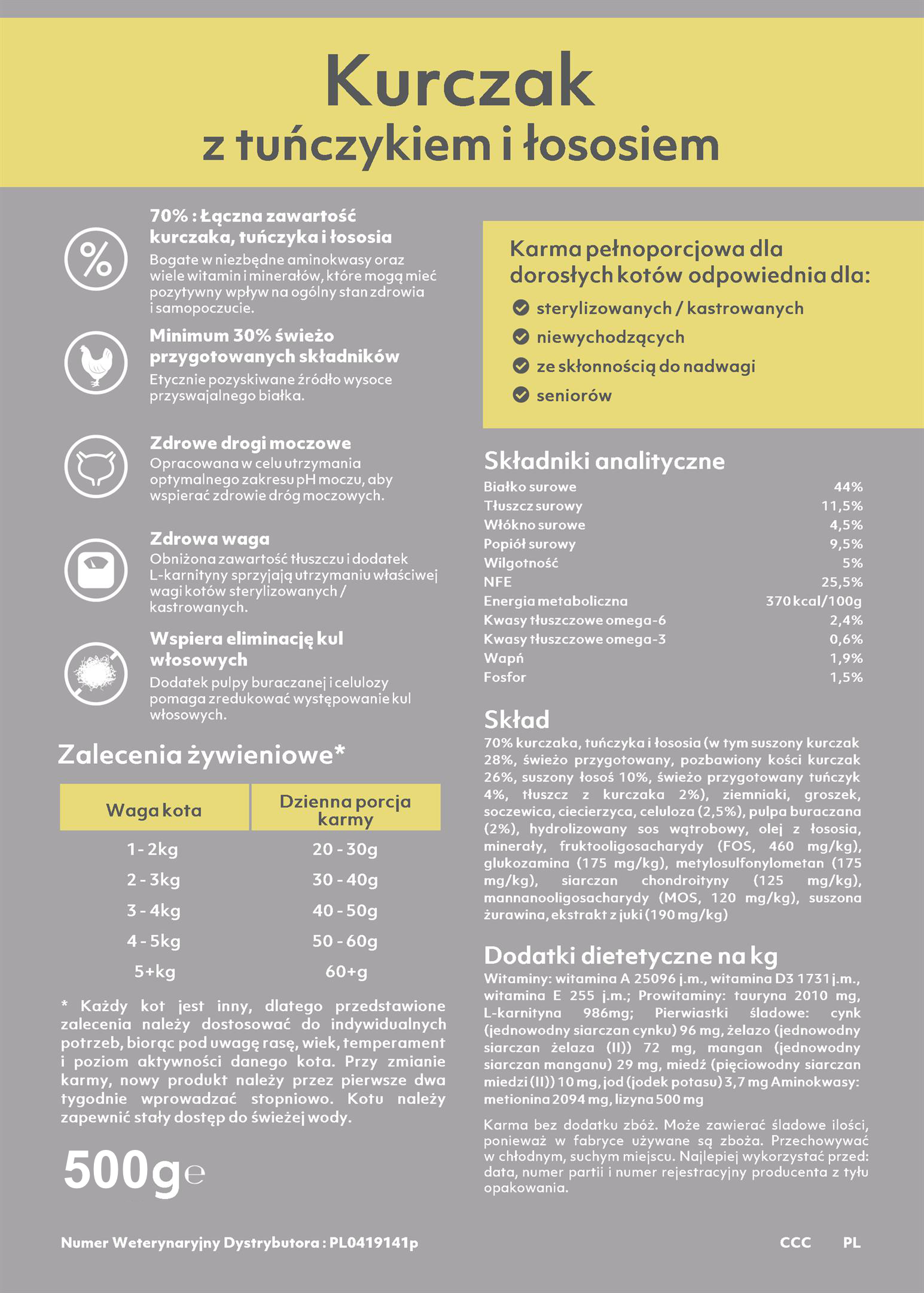 Receptura oparta jest na kilku starannie dobranych źródłach białka zwierzęcego – m.in. kurczaku, tuńczyku i łososiu – dzięki czemu dostarcza kompletu niezbędnych aminokwasów, witamin i minerałów.