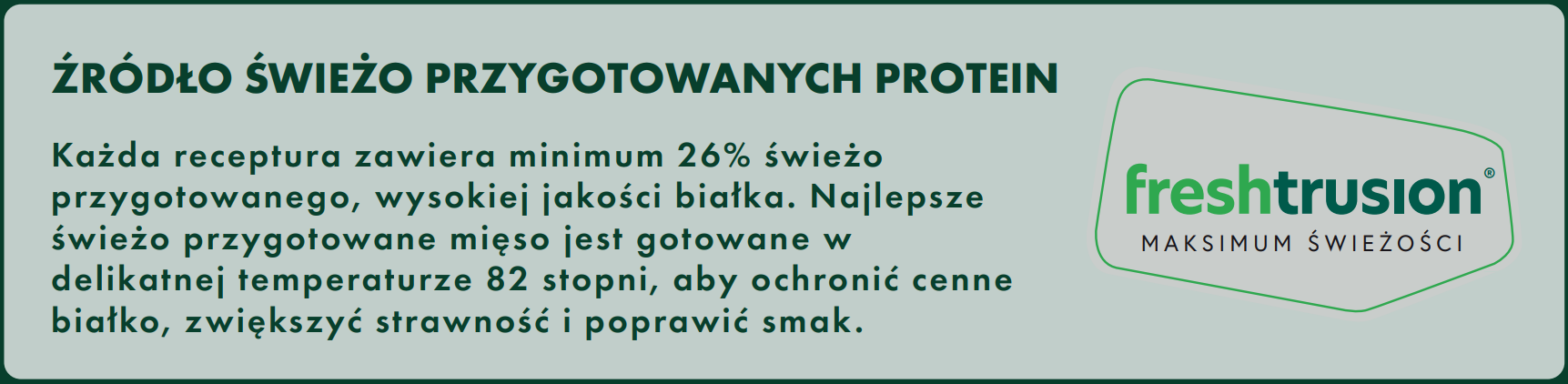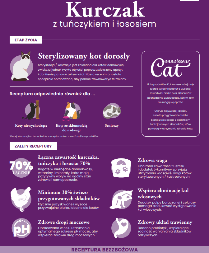 Pełnoporcjowa sucha karma bezzbożowa, opracowana z myślą o dorosłych kotach, w tym kotach sterylizowanych, seniorach oraz niewychodzących, Formuła hipoalergiczna, z dodatkiem żurawiny, celulozy oraz kompleksem wspierającym zdrowie układu moczowego i redukcję kul włosowych. Charakteryzuje się bardzo wysoką zawartością mięsa i ryb – aż 70%, w tym, opatentowany system FRESHTRUSION umożliwia dodatek 30% świeżo przygotowanych składników mięsnych. Gotowana delikatnie w 82°C, co zapewnia wysoką strawność i smakowitość.