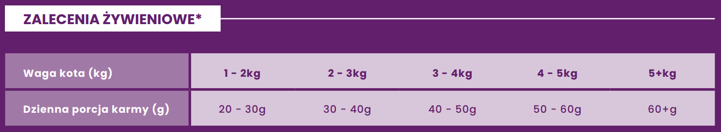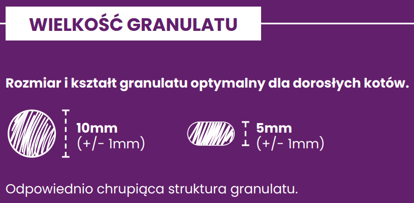 Tabela dawkowania dostępna w zdjeciu poniżej. Odpowiednio chrupiąca struktura granulatu. 10mm (+/- 1mm) 5mm (+/- 1mm) Rozmiar i kształt granulatu optymalny dla dorosłych kotów.