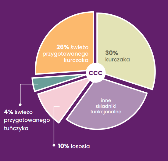 🥩Solidne źródła białka zwierzęcego 70% – Kurczak, tuńczyk i łosoś, w tym Minimum 30% świeżo przygotowanego kurczaka i tuńczyka –