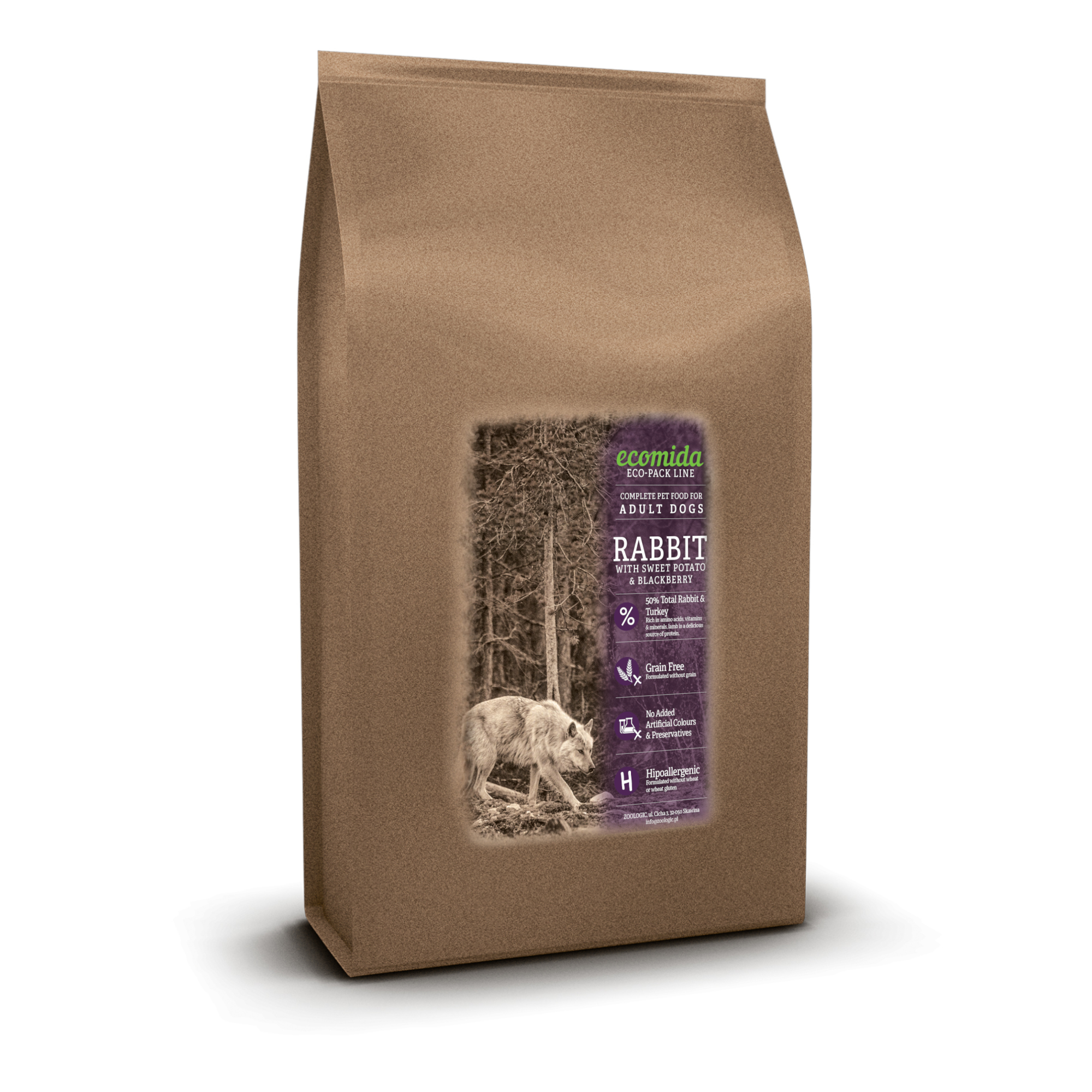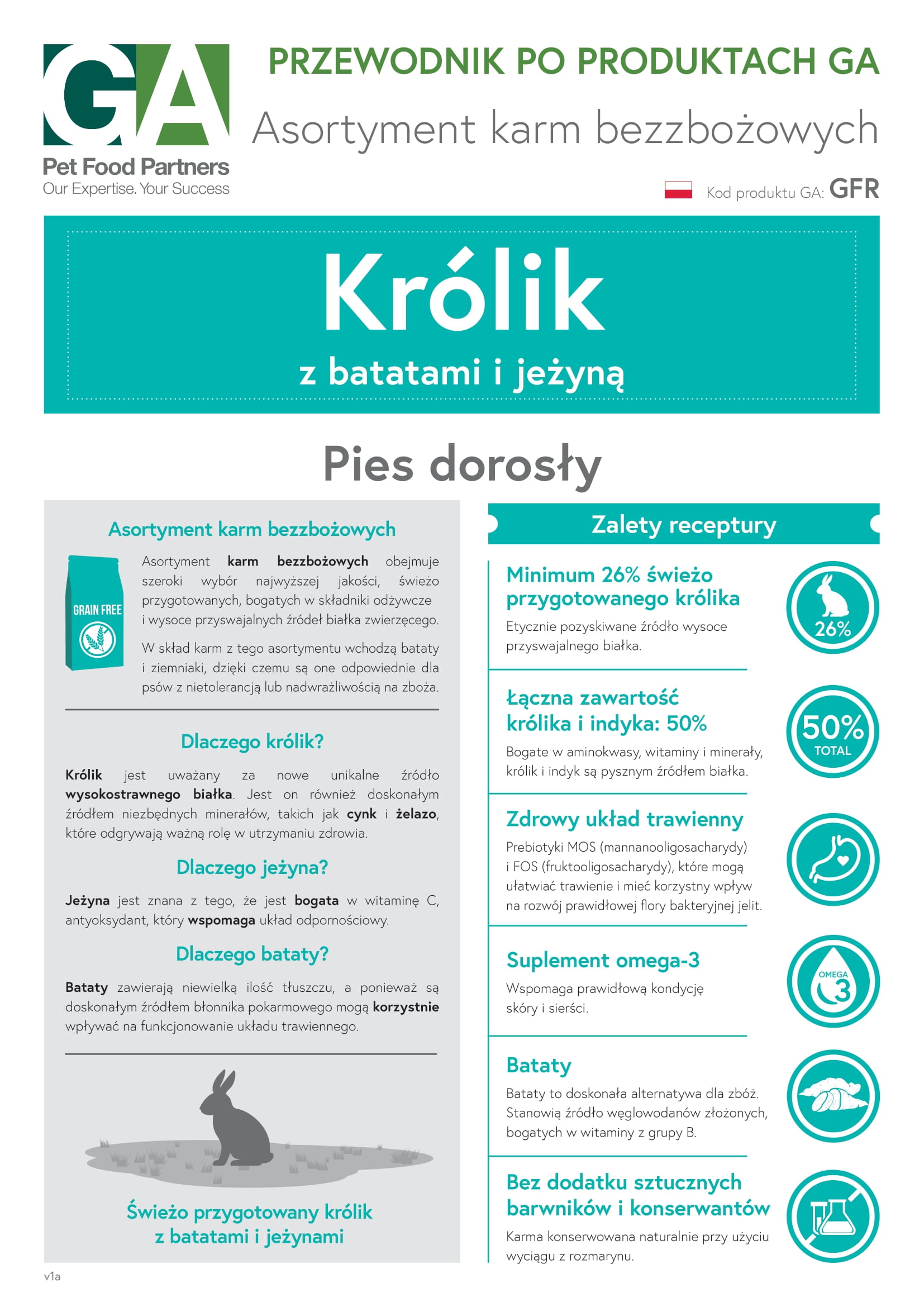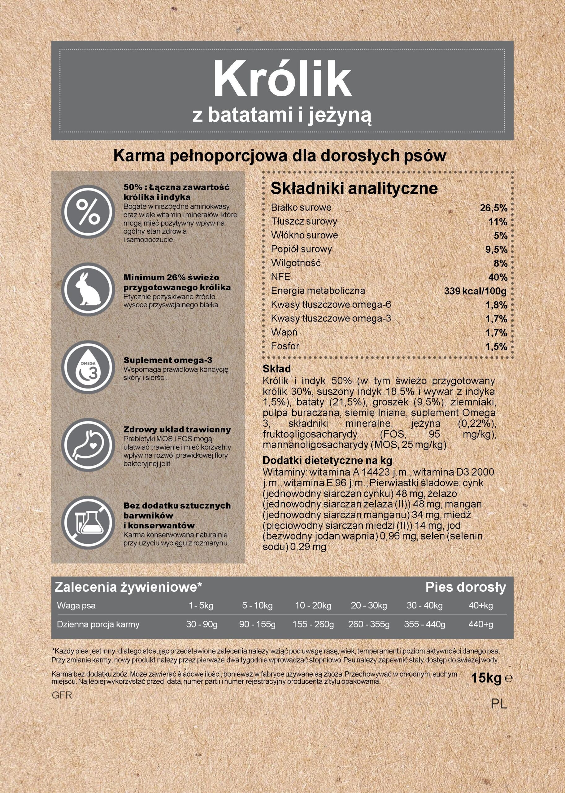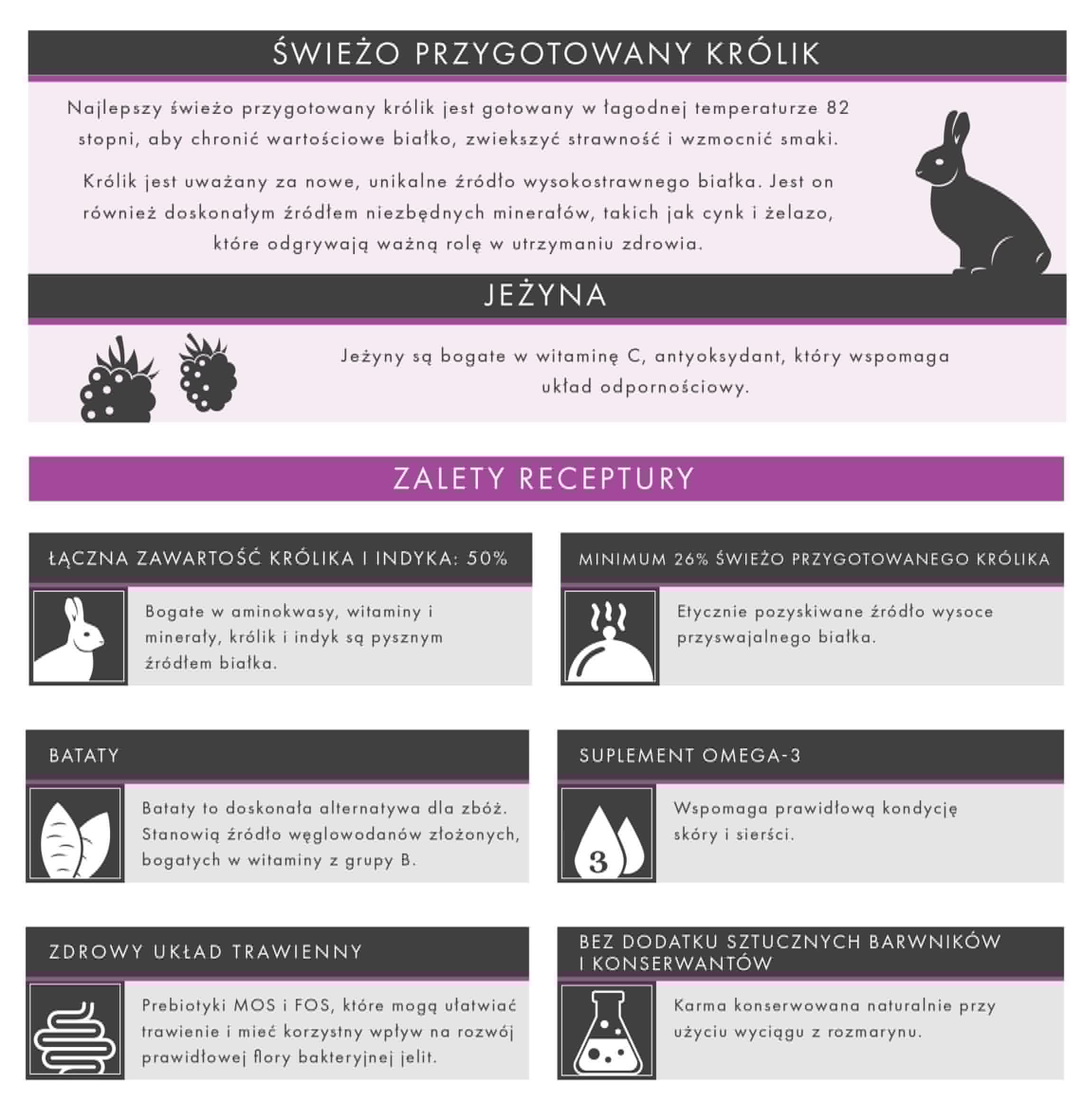 Królik i indyk 50% (w tym świeżo przygotowany królik 30%, suszony indyk 18,5% i wywar z indyka 1,5%), bataty (21,5%), groszek (9,5%), ziemniaki, pulpa buraczana, siemię lniane, suplement Omega 3, składniki mineralne, jeżyna (0,22%), fruktooligosacharydy (FOS, 95 mg/kg), mannanoligosacharydy (MOS, 25 mg/kg)