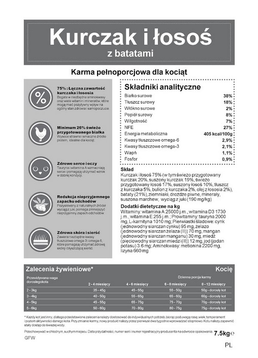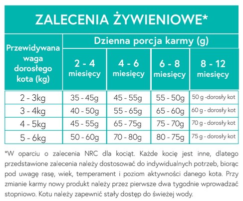 Kocięta rosną szybko. W wieku 6 miesięcy osiągają wagę odpowiadającą niemal 75% masy ciała dorosłego osobnika, dlatego też zapewnienie odpowiedniej diety jest niezbędne, by kocięta rozwijały się prawidłowo. Nasz produkt jest pełnowartościową karmą o zwiększonej zawartości energii, której koty potrzebują szczególnie w okresie wzrostu. Ponadto karma zawiera więcej białka bogatego