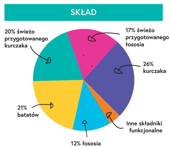 Łosoś jest źródłem niezbędnych kwasów tłuszczowych omega-3, które mają właściwości przeciwzapalne i wspomagają prawidłową kondycję skóry, sierści i stawów.