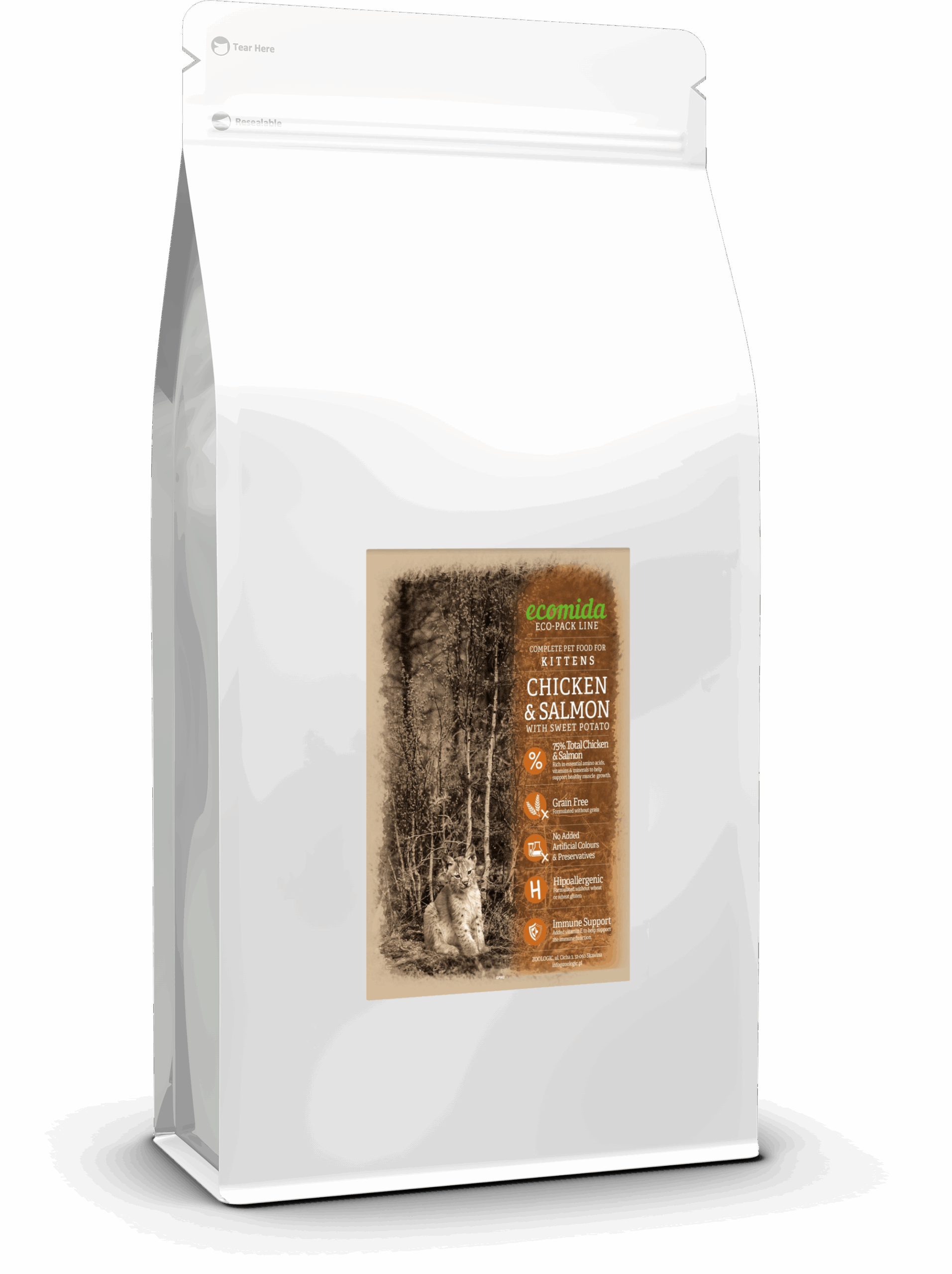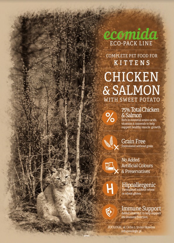 Ecomida hypoalergiczna karma bezzbożowa dla kociąt z kurczakiem, łososiem i batatami. To doskonałe rozwiązanie dla młodego, rosnącego kota, bogate w wysoko przyswajalne białko (75% kurczaka i łososia w białku ogólnym)