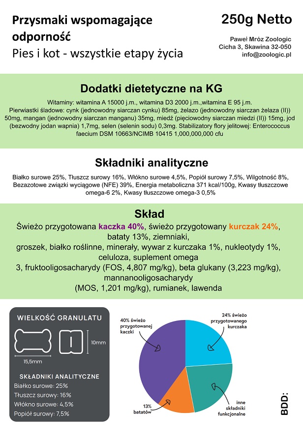 komforcie życia. Receptura została opracowana w taki sposób aby wspomagać układ immunologiczny i poprawiać ogólny stan zdrowia i samopoczucia zwierząt.
