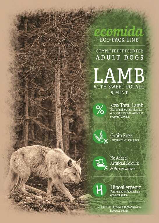 Dobrze zbilansowana karma ecomida z jagnięciną dla psów dorosłych. Hipoalergiczne i bezzbożowe pożywienie dla psów. Znakomicie sprawdzi się u psów z nietolerancją na białko drobiowe.