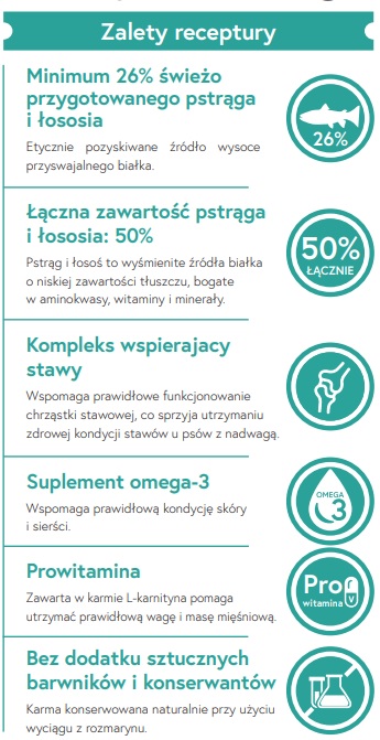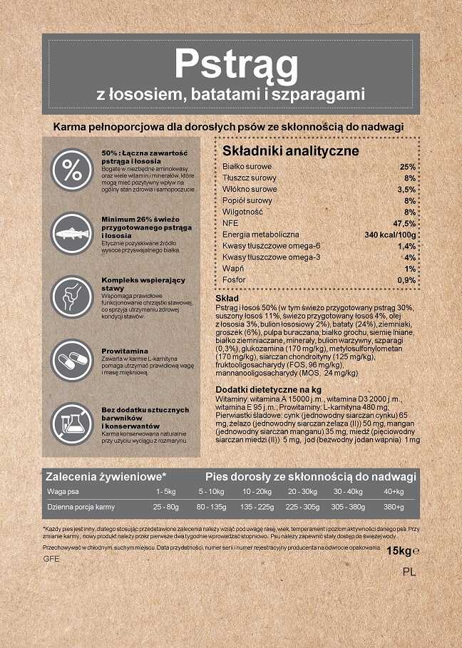 Pstrąg i łosoś 50% (w t ym świeżo przygotowany pstrąg 30%, suszony łosoś 11%, świeżo przygotowany łosoś 4%, olej z łososia 3%, bulion łososiowy 2%), bataty (24%), ziemniaki, groszek (6%), pulpa buraczana, białko grochu, siemię lniane, białko ziemniaczane, minerały, szparagi (0,3%), glukozamina (170 mg/kg), met ylosulfonylometan (170 mg/kg), siarczan chondroit yny (125 mg/ kg), fruktooligosachar ydy (FOS, 96 mg/kg), mannanooligosachar ydy (MOS, 24 mg/kg)