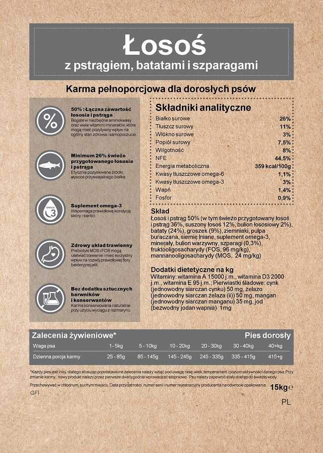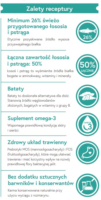 Łosoś i pstrąg 50% (w tym świeżo przygotowany łosoś i pstrąg 36%, suszony łosoś 12%, bulion łososiowy 2%), batat y (24%), groszek (9%), ziemniaki, pulpa buraczana, siemię lniane, suplement omega-3, minerały, szparagi (0,3%), fruktooligosacharydy (FOS, 96 mg/kg), mannanooligosacharydy (MOS, 24 mg/kg)