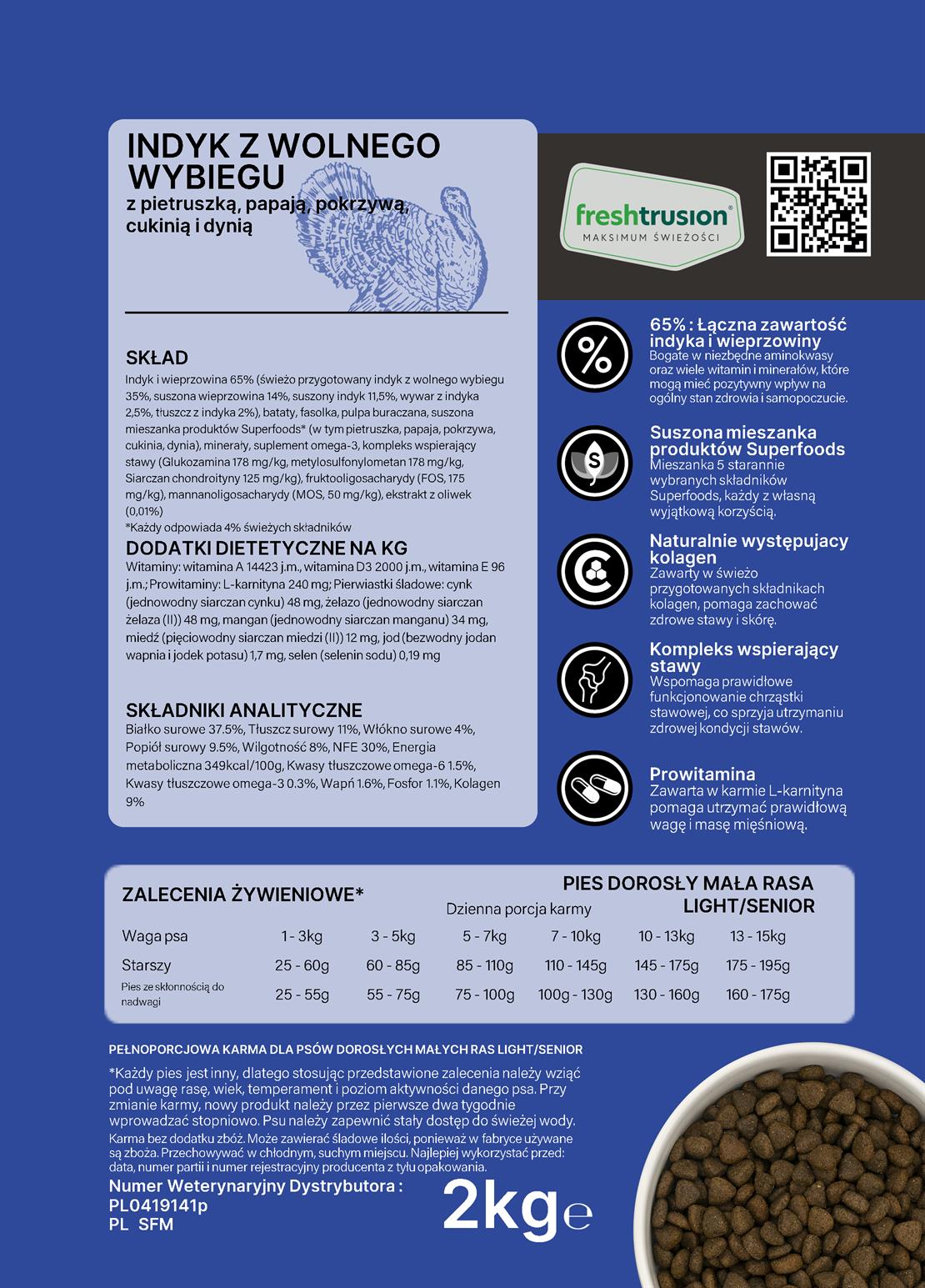 Lekka, pełnoporcjowa karma sucha klasy Super Premium, opracowana z myślą o dorosłych psach ras małych, mniej aktywnych, z nadwagą oraz dla posów w wieku seniorskim. Zawiera 65% składników pochodzenia zwierzęcego, z czego minimum 35% to świeżo przygotowany indyk z wolnego wybiegu – naturalne źródło białka i kolagenu, który wspiera zdrowe stawy, mocne kości oraz elastyczną skórę i lśniącą sierść. Dodatek L-karnityny i obniżona zawartość tłuszczu, sprzyja utrzymaniu własciwej wagi i dodaje wigoru i witalności psom starszym.
