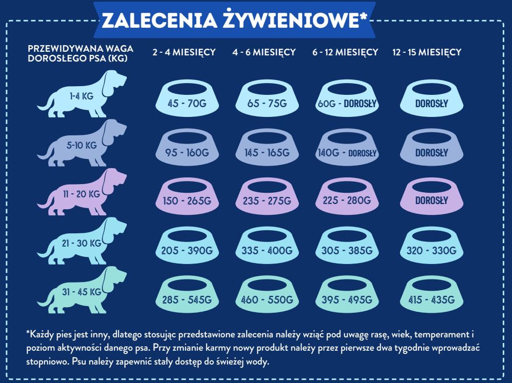 Podane wartości są orientacyjne – należy dostosować porcję do rasy, wieku, temperamentu i aktywności psa. Przy zmianie karmy należy przeprowadzić stopniowe przejście w ciągu 14 dni. Zawsze zapewnij psu dostęp do świeżej wody.
