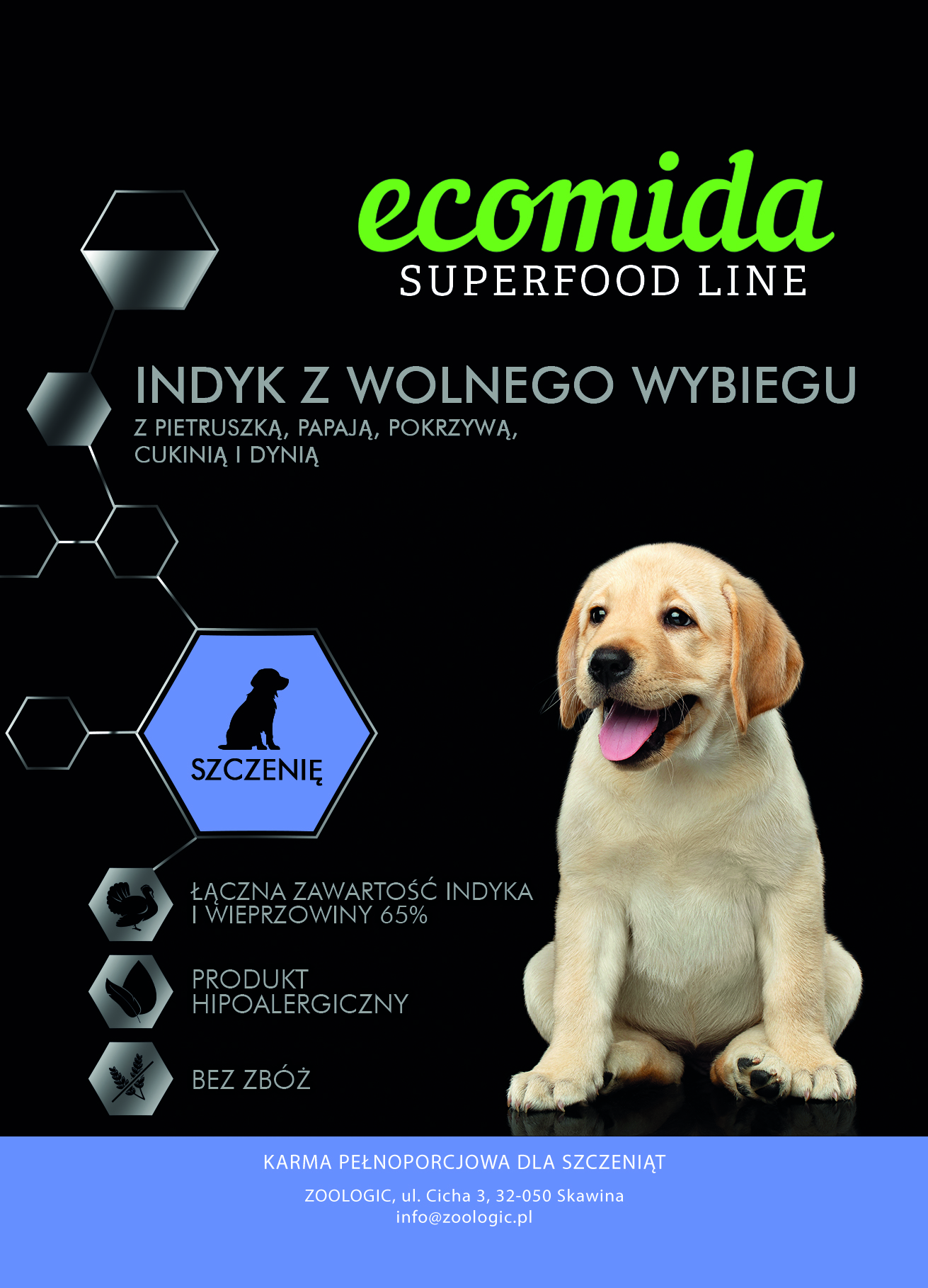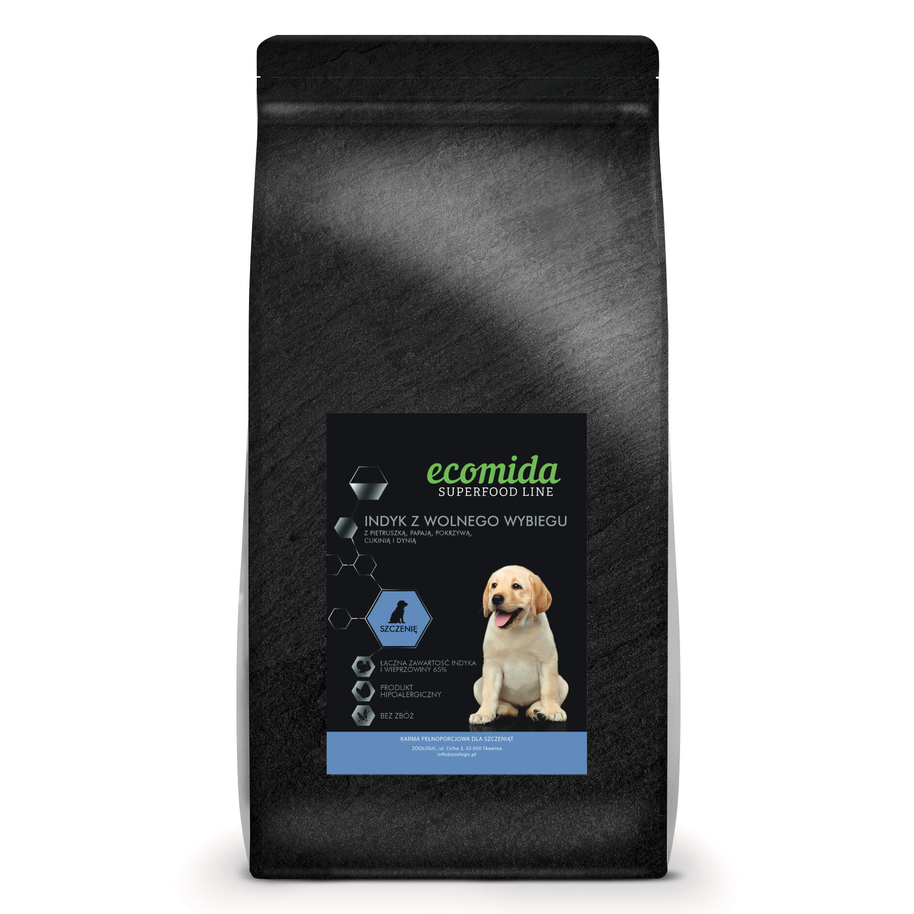 🐶 Ecomida Superfood 65 – pełnowartościowa, bezzbożowa receptura z indykiem z wolnego wybiegu i naturalnym kolagenem, stworzona, by zasilać małych odkrywców w ich codziennych przygodach.