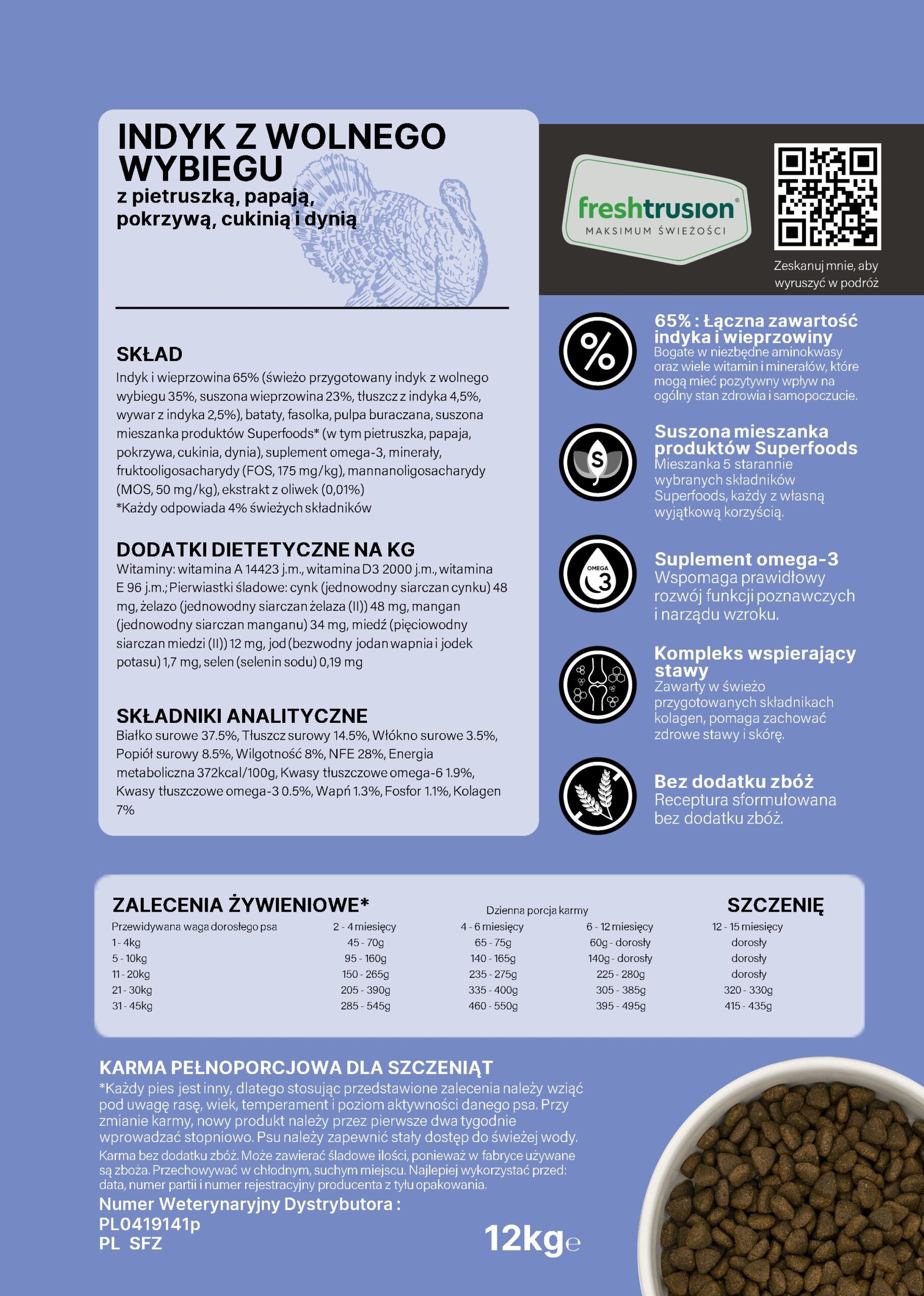 🍗 35% świeżo przygotowanego indyka z wolnego wybiegu – delikatnie gotowany, świetna strawność.