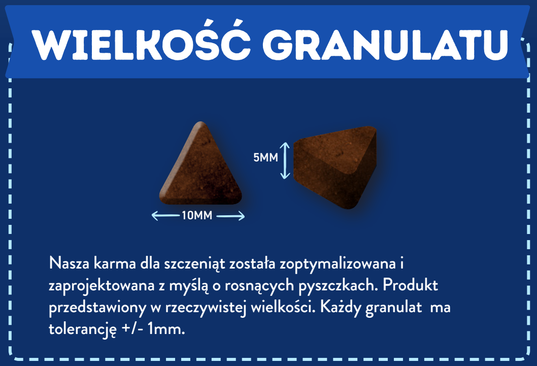 Recepturę uzupełnia mieszanka 5 funkcjonalnych Superfoods: pietruszki, papai, pokrzywy, cukinii i dyni – każde z nich zostało wybrane przez dietetyków ze względu na unikalne korzyści zdrowotne. Dodatkowo wzbogacona o omega-3, witaminy i minerały, karma wspiera rozwój funkcji poznawczych, odporność i prawidłowy wzrost szczeniąt.