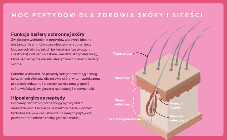 Zastosowanie peptydów dla pielęgnacji skóry i sierści, zwiększa strawność i biodostępność białka. Hydrolizowane peptydy z łososia i białej ryby, pomagają w utrzymaniu i odnowie skóry oraz jej funkcji bariery ochronnej. Peptydy kolagenowe wspierają elastyczność i ogólny stan zdrowia skóry. Dieta zawiera optymalne poziomy kwasów omega-3 i 6 dla odpowiedniego nawilżenia skóry i utrzymania miękkiej, lśniącej sierści.
