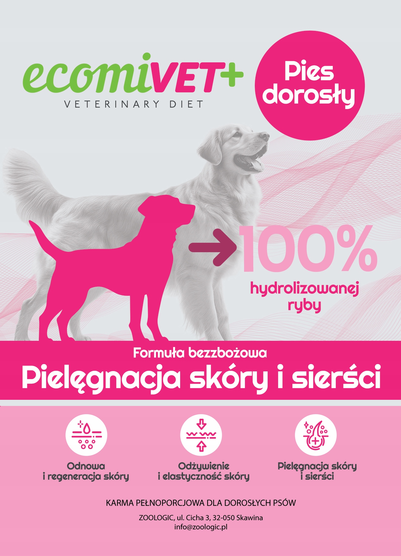 ecomiVET+ Pielęgnacja Skóry i Sierści to dieta specjalnie opracowana, aby wspierać zdrowie skóry i sierści, ograniczać problemy dermatologicznemogące być wynikiem nadwrażliwości lub alergii na białko w diecie. Poprzez hydrolizę 100% białka, w celu stworzenia małych peptydów, prawdopodobieństwo niepożądanej reakcji jest minimalne.Dodatkowo, Formuła Bezzbożowa, jest idealna dla psów z nietolerancją lub nadwrażliwością na zboża.