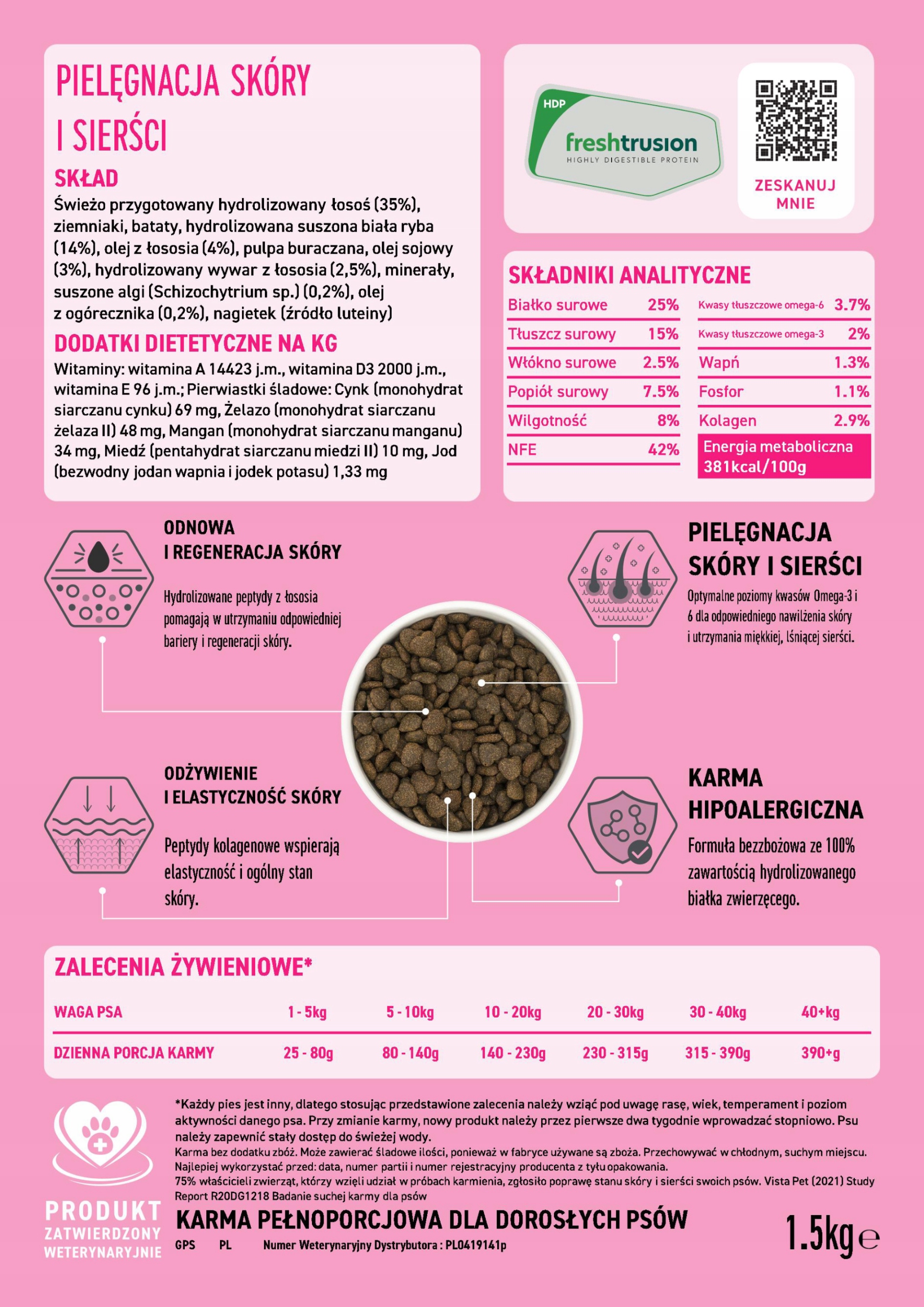 Pełnoporcjowa, hipoalergiczna, bezzbożowa dieta dla psów dorosłych z problemami Dermatologicznymi, Skórą i Sierścią. Proces Freshtrusion HDP zwiększa strawność i biodostępność zastosowanej świeżo przygotowanego łososia. 100% Hydrolizowane, krótkie łańcuchy peptydów (Dipeptydy i Tripeptydy), zwiększają przyswajalność białka bez obciążania układu pokarmowego, ograniczając możliwość wystąpienia reakcji alergicznych.
