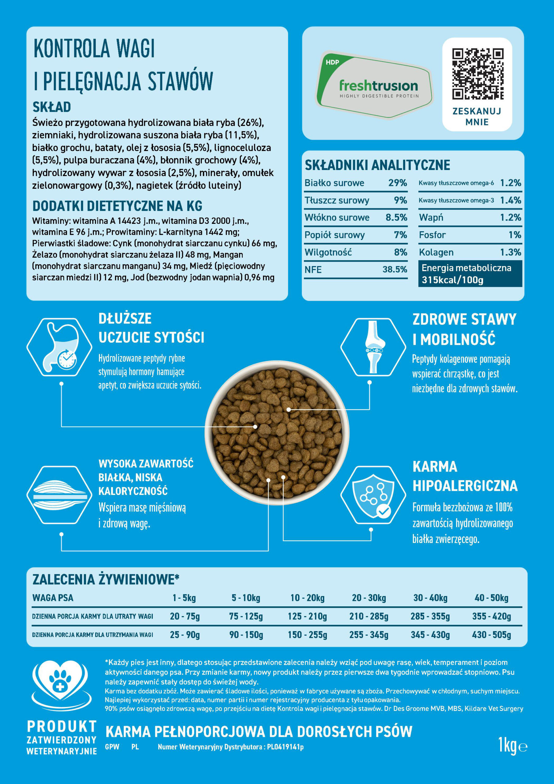 Pełnoporcjowa, hipoalergiczna, bezzbożowa dieta dla psów dorosłych, Niska Zawartość Tłuszczu, Kontrola Wagi i Pielęgnacja Stawów. Proces Freshtrusion HDP zwiększa strawność i biodostępność zastosowanej świeżo przygotowanej Białej Ryby. 100% Hydrolizowane, krótkie łańcuchy peptydów (Dipeptydy i Tripeptydy), zwiększają przyswajalność białka bez obciążania układu pokarmowego, ograniczając możliwość wystąpienia reakcji alergicznych.