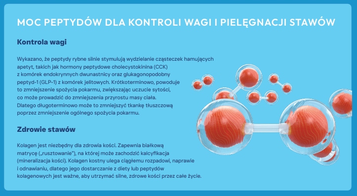 Zastosowanie peptydów dla kontroli wagi i zdrowia stawów, zwiększa strawność i biodostępność białka. Znacząco poprawia smakowitość receptury oraz zapewnia idealną podaż bloków budulcowych aminokwasów wymaganych do odnowy i syntezy kluczowych hormonów peptydowych i białek, takich jak kolagen. Stymuluje wydzielanie molekuł tłumiących apetyt, co może powodować zmniejszenie spożycia pokarmu przez zwiększenie uczucia sytości oraz pomaga wspierać i utrzymywać zdrowe stawy oraz odzyskiwać mobilność.