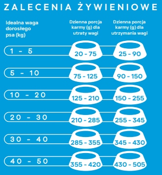 Ta receptura ma dwa różne zalecenia żywieniowe, wyrażone w dobowym dawkowaniu pokarmu!  Jedna na obniżenie wagi i druga na utrzymanie właściwej wagi psa.