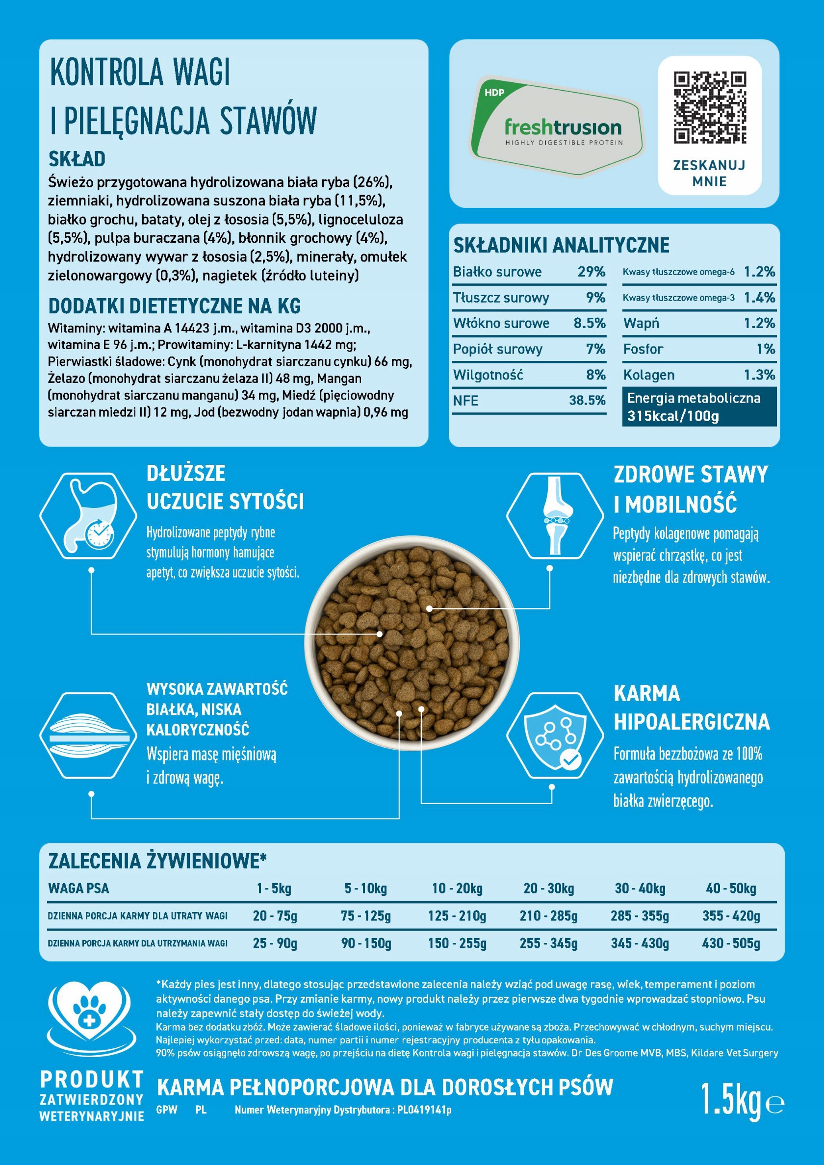 Pełnoporcjowa, hipoalergiczna, bezzbożowa dieta dla psów dorosłych, Niska Zawartość Tłuszczu, Kontrola Wagi i Pielęgnacja Stawów. Proces Freshtrusion HDP zwiększa strawność i biodostępność zastosowanej świeżo przygotowanej Białej Ryby100% Hydrolizowane, krótkie łańcuchy peptydów (Dipeptydy i Tripeptydy), zwiększają przyswajalność białka bez obciążania układu pokarmowego, ograniczając możliwość wystąpienia reakcji alergicznych.