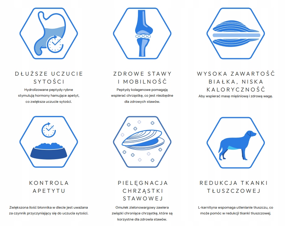 Zastosowanie peptydów dla kontroli wagi i zdrowia stawów, zwiększa strawność i biodostępność białka. Znacząco poprawia smakowitość receptury oraz zapewnia idealną podaż bloków budulcowych aminokwasów wymaganych do odnowy i syntezy kluczowych hormonów peptydowych i białek, takich jak kolagen. Stymuluje wydzielanie molekuł tłumiących apetyt, co może powodować zmniejszenie spożycia pokarmu przez zwiększenie uczucia sytości oraz pomaga wspierać i utrzymywać zdrowe stawy oraz odzyskiwać mobilność.