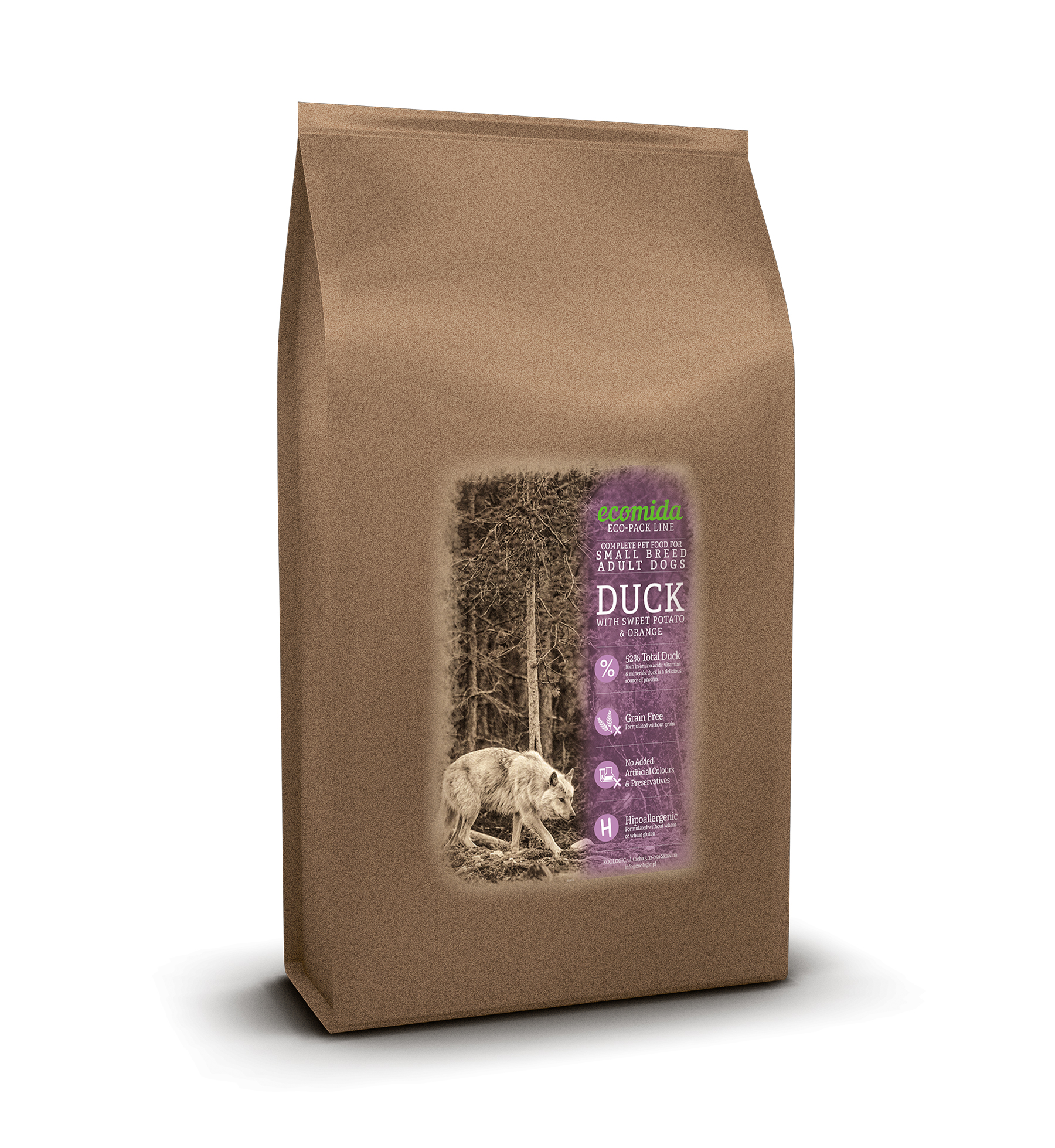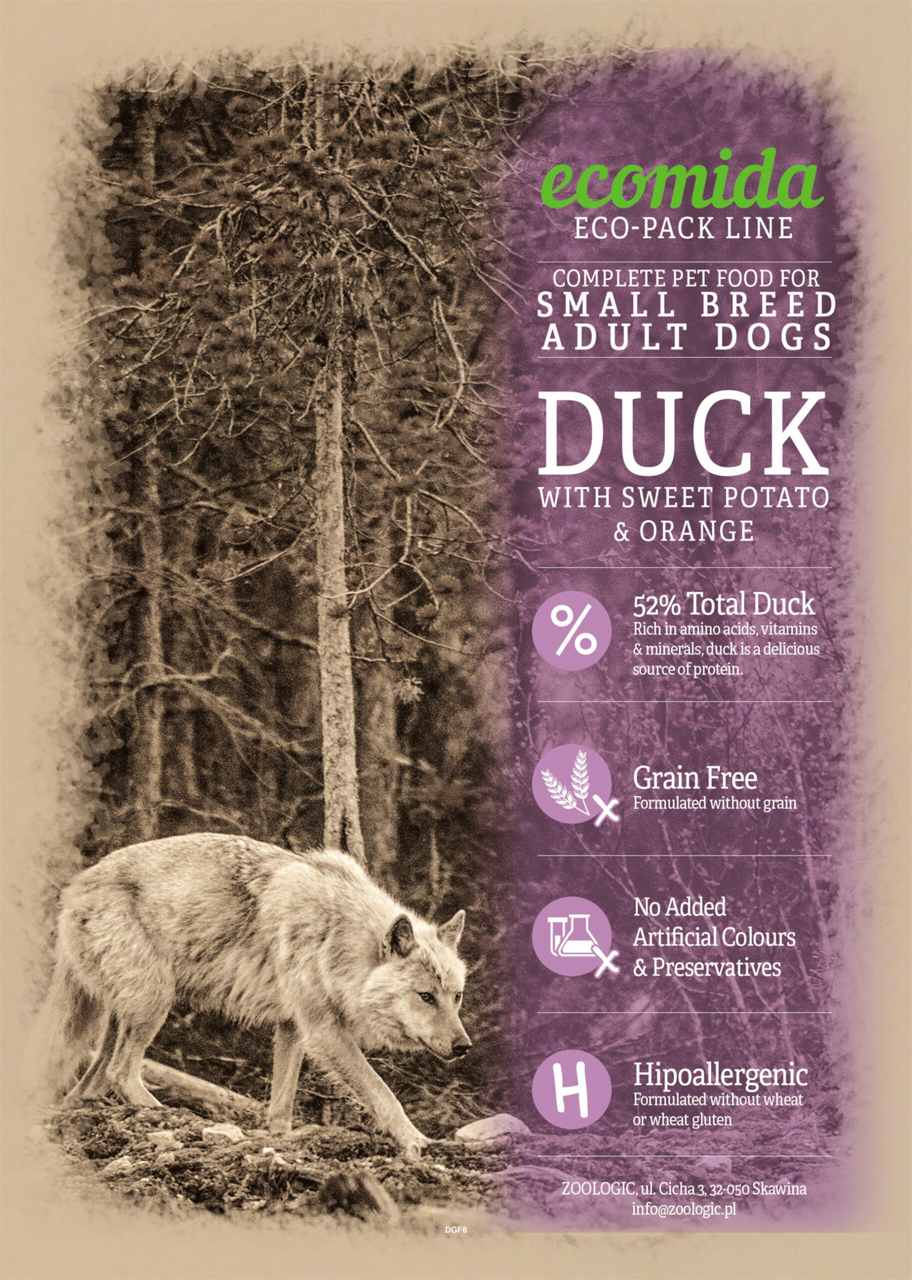 Karma Ecomida z kaczką dla psów dorosłych ras małych i miniaturowych. Bezzbożowa karma z kaczką to odpowiednio zbilansowany posiłek nawet dla psa z nadwrażliwością lub alergią pokarmową.